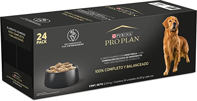 Purina® Pro Plan® Adult, Alimento húmedo Carne en salsa es un alimento húmedo desarrollado específicamente para perros adultos de todas las razas Los sistemas corporales del perro deben funcionar en armonía, por ello hay un alimento adecuado para cada etapa de su vida. Purina® Pro Plan® Adult, Alimento húmedo Carne en Salsa es un alimento húmedo completo y balanceado para perros adultos de todas las razas. Su contenido de ácidos grasos Omega 3 y 6, vitaminas y minerales clave como cobre y selenio, optimizan la digestión, ayudando a mantener una piel sana y un pelaje brillante. Además, refuerza el sistema inmunológico para que sea capaz de reaccionar adecuadamente a los desafíos de la salud. Asimismo, promueve un tracto gastrointestinal y dermatológico sanos para permitirle expresar todo su potencial de forma adecuada. "Mantiene la masa muscular y el sistema inmune sanos. Adecuado aporte de energía y sana digestión. Optimiza la digestión y ayuda a mantener una piel sana y un pelaje brillante.Contiene proteína de pollo para mantener la masa muscular y el sistema inmune sanos. Con partículas grandes especialmente diseñadas para las mandíbulas de los perros de razas grandes para promover la masticación lenta. Con un aporte óptimo vitaminas y minerales."