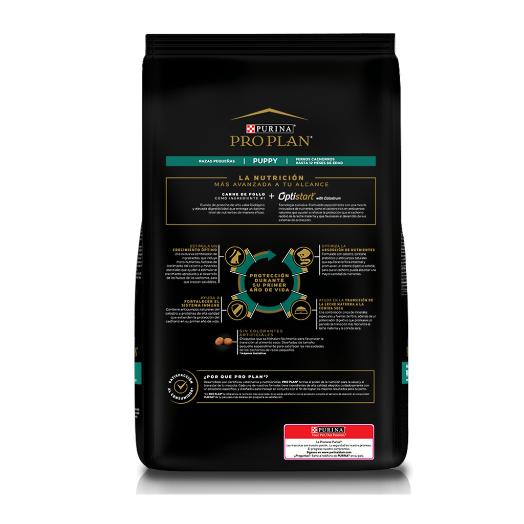 Purina Pro Plan Puppy Razas Pequeñas con OptiStart, carne real de pollo, calostro, DHA y EPA del aceite de pescado, Omega 3, calcio y fósforo es un plan de alimentación formulado específicamente para cachorros de razas pequeñas en crecimiento en croquetas de menor tamaño diseñadas especialmente para ellos.