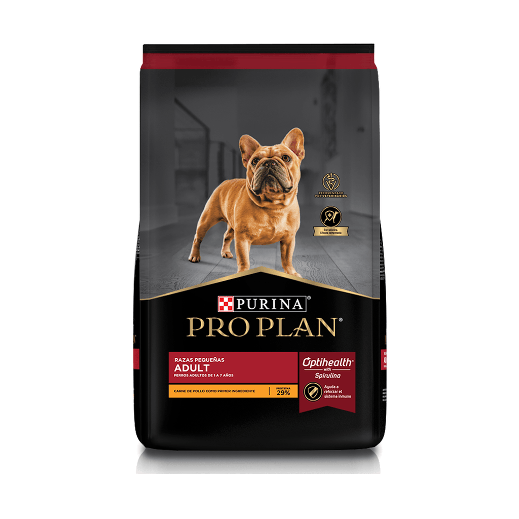 Purina® Pro Plan® Adulto Razas Pequeñas, Alimento Seco OptiHealth®, carne real de pollo es un alimento de vanguardia para perros adultos de razas pequeñas con Alga Spirulina, vitamina A y E, calcio, fósforo, Omega 3 y 6 y 29% de proteína. La fórmula ideal para mantenerse sanos y activos La alimentación de los perros se debe adecuar a cada etapa de vida y tamaño del perro, por ello desarrollamos Purina® Pro Plan® Adulto Razas Pequeñas, Alimento Seco OptiHealth® y carne real de pollo, una nutrición de vanguardia que ayuda a las necesidades específicas de los perros adultos alcanzando un estado de salud óptimo y un bienestar general. Con OptiHealth® desarrollado con incorporación de Alga Spirulina cuya efectividad ha sido científicamente probada para reforzar el sistema inmune y digestivo. Con vitamina A y E, ayudan a mantener las defensas naturales del sistema inmunológico. Ayuda a optimizar la absorción de nutrientes clave fortaleciendo y estabilizando la microflora intestinal. Contiene proteínas de calidad de carne fresca de pollo que son altamente digestibles y presentan alto valor biológico, reduciendo la generación de residuos protéicos. Con óptimo balance de calcio y fósforo para mantener dientes sanos y fiertes. Con ácidos grasos, Omega 3 y 6 que sumados a las vitaminas y minerales promueven una piel flexible y un pelaje resistente y brillante reforzando la barrera cutánea para protegerlo de amenazas externas. Nutrición concentrada con 29% de proteína y 17% de grasa garantizando la cantidad de energía que necesitan para mantenerse sanos y activos Ayuda a reforzar el sistema inmune. Fortalece la flora intestinal. Refuerza la barrera cutánea. Mantiene la salud oral.