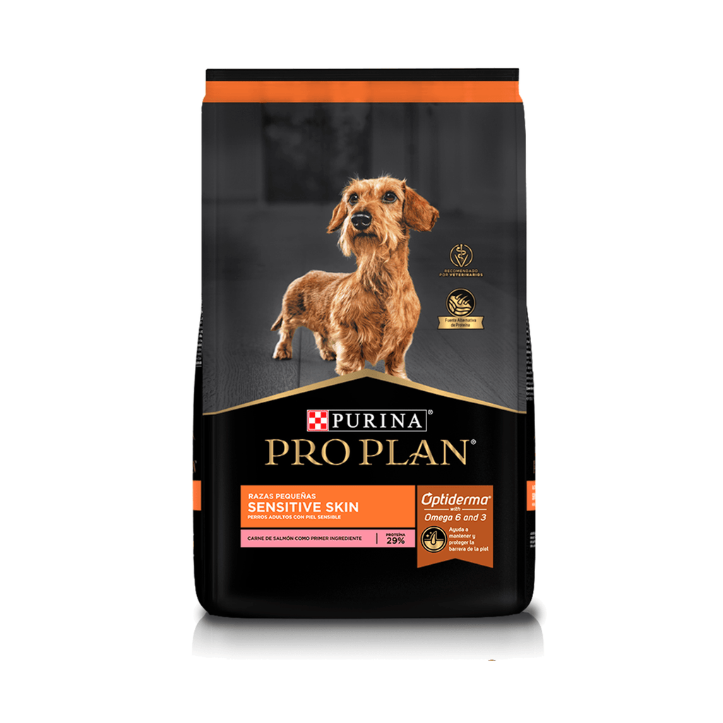 Purina® Pro Plan® Sensitive Skin Adult Razas Pequeñas, Alimento Seco OptiDerma® con carne real de salmón, Omega 3 y 6, antioxidantes naturales, vitaminas, cobre, zinc y selenio para perros adultos de razas pequeñas con piel y pelaje sensible El cuidado de la piel en los perros es sumamente importante, es por ello que en conjunto con veterinarios y nutricionistas desarrollamos Purina® Pro Plan® Sensitive Skin Adult para Razas Pequeñas con OptiDerma® para aquellos perros adultos de razas pequeñas con piel y pelaje sensible. La tecnología de vanguardia OptiDerma® está formulada con carne fresca de Salmón como fuente alternativa de proteínas de alta calidad, ideal para perros sensibles, rico en ácidos grasos Omega 3 y 6, para la belleza y salud general. Su mezcla de antioxidantes naturales e importantes vitaminas y minerales esenciales como el cobre, zinc y selenio, refuerzan la protección de la piel y promueven una piel flexible y pelaje brillante. Además, sus ingredientes de alta calidad proporcionan un gran sabor y su balance de nutrientes mantienen una salud óptima fortaleciendo su sistema inmunológico y minimizando el riesgo de irritaciones en la piel. Ayuda a mantener y proteger la barrera de la piel. Minimiza el riesgo de irritación de la piel. Ayudaa fortalecer el sistema inmune